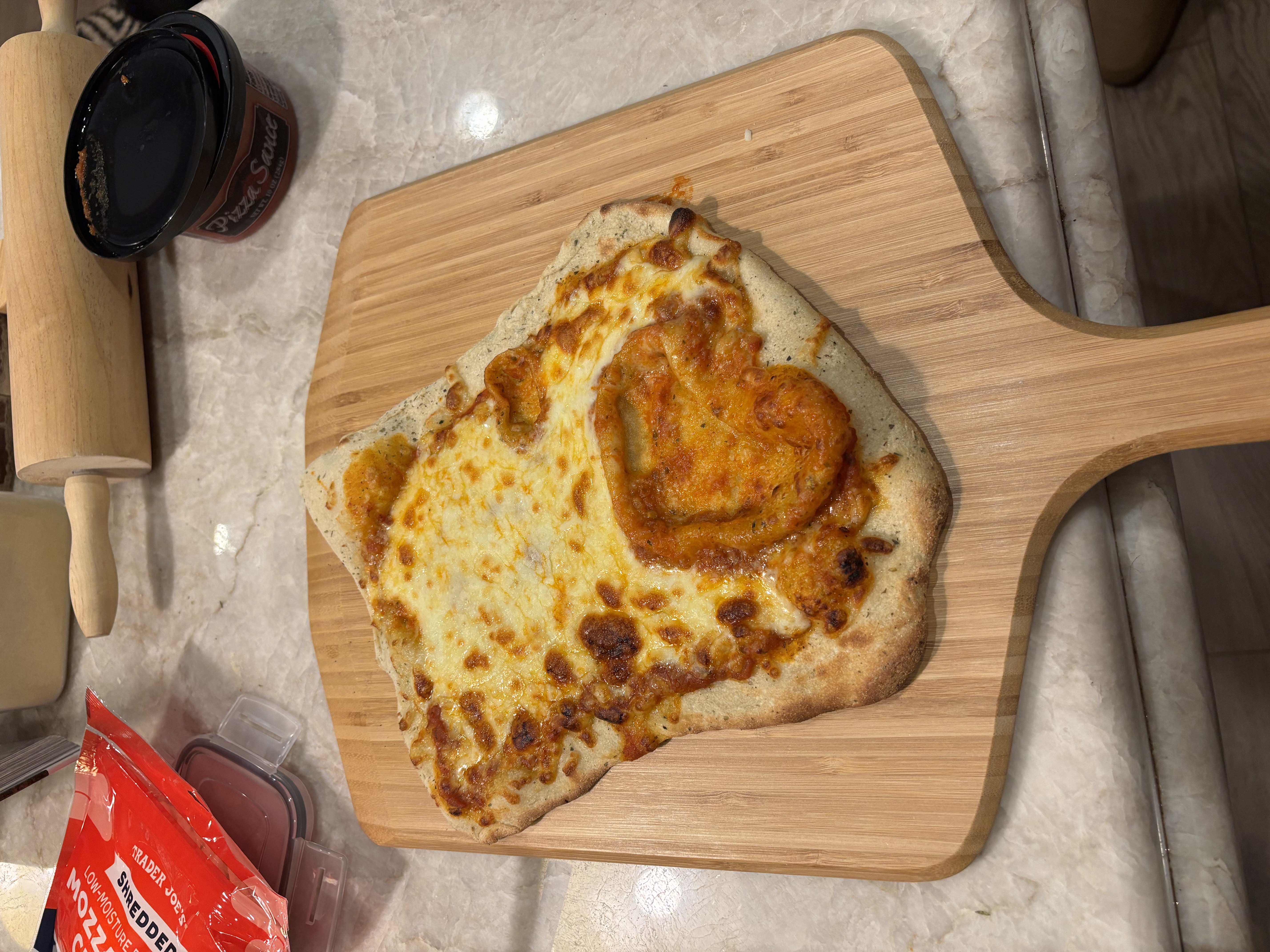 We decided to keep it simple: a classic cheese pizza. We rolled out the dough, added a generous layer of mozzarella, and slid it into the oven with our shiny new wooden peel. But here’s where the adventure took another twist. In our enthusiasm, we had overworked the dough with the rolling pin, introducing air pockets that became massive bubbles during baking. When the pizza came out, we couldn’t stop laughing—it looked like a creature from another world, complete with giant “pizza brains.” Despite its appearance, the crust was golden, the cheese was perfectly melted, and the flavor was undeniable.